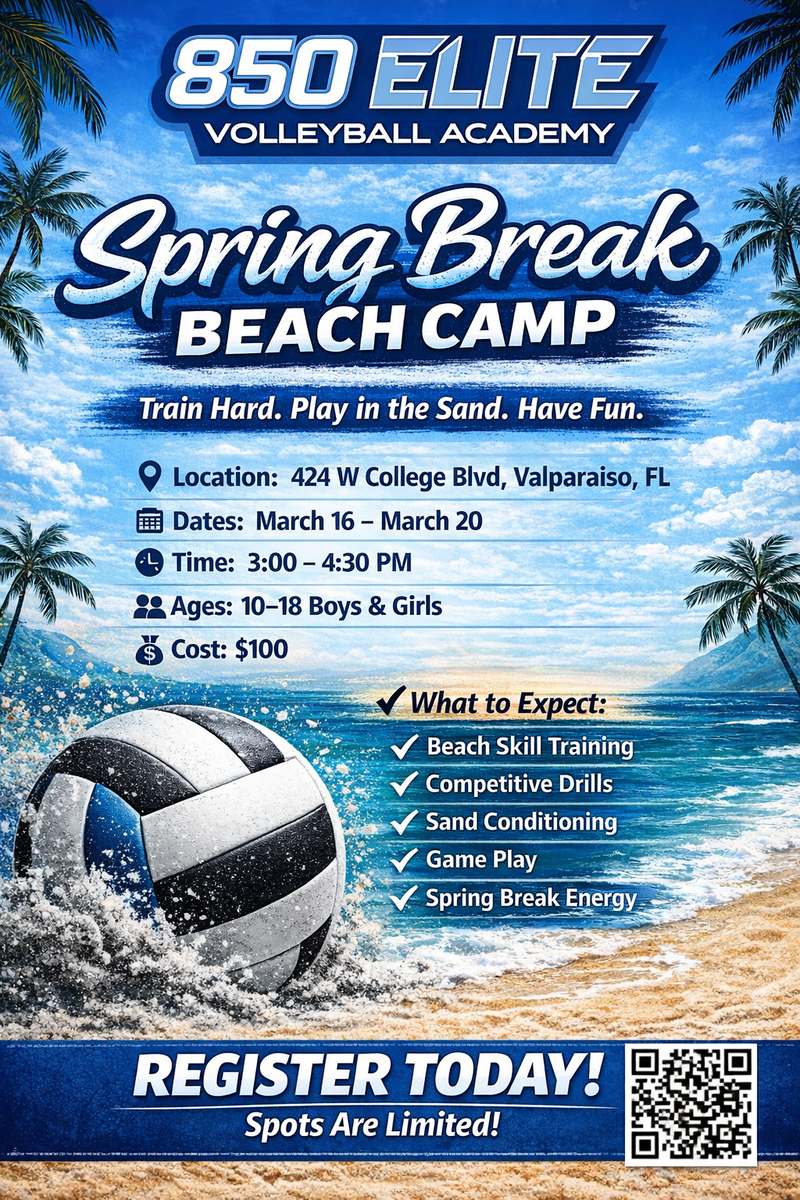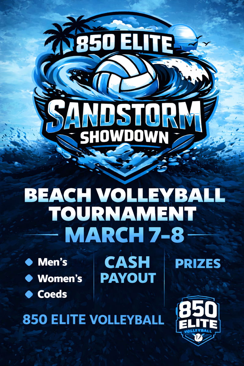 Beach Volleyball is back for its second season, led by our experienced Beach Coaches- Coach Saleena and Coach Sammy! Practices are held at our 850 Elite Beach Courts right outside our indoor facility! Below are details regarding our 2025 beach season: - Start: April 28th - End: July 3rd - Practices: M/W 6:30-8:00pm (Novice), T/Th 6:00-7:30pm (Competitive) - Price: $750 - Includes: 850 Elite VC Tank Top Players will be grouped into Novice (new to beach, limited experience) and Competitive (previous beach experience through school or official tournament play). Novice will be encouraged to play 1 tournament over the course of our season. Competitive will be required to play at least 1 tournament in which our coaches will attend the event. *If you sign up for the Competitive program, but do not have the experience mentioned, you will be moved to the Novice training program.* It isn’t too late to sign up! For any questions regarding Beach Volleyball, please contact admin@850elitevc.com